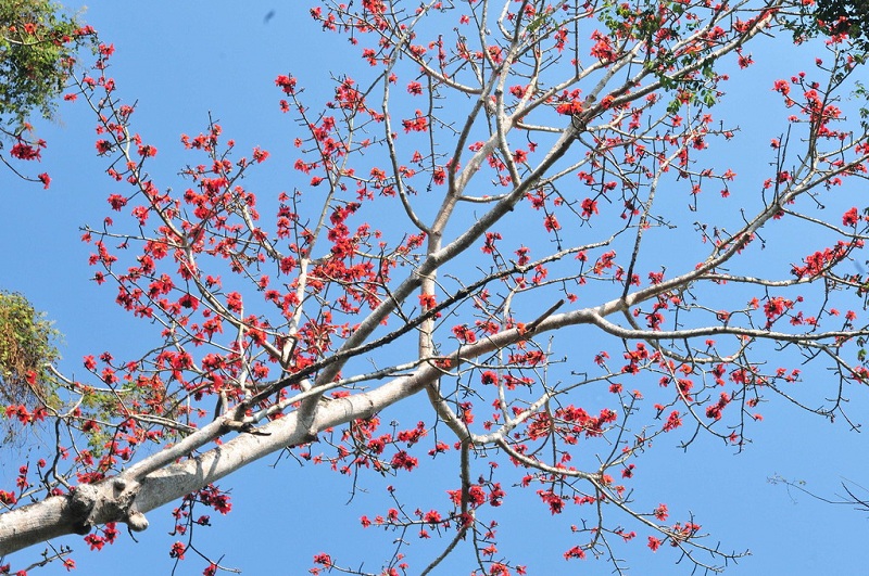 咦,春天來了。這粗糙且?guī)Я龃痰能|干,干枯的樹枝,雖然挺拔,但總歸突顯蒼老。不曾想,這毫不起眼的枯樹,卻在這春意盎然的雨天,綻放出火焰般的生命,這突如其來的綻放似那騰空而起的煙花,一樣的耀眼卻不一樣的安靜。駐足凝視,這碗大的花朵,恰似染紅的羽毛球,五片擁有強(qiáng)勁曲線的花瓣,包圍一束綿密的黃色花蕊,收束于緊實的花托。此花素而不艷、嫩而不嬌、爽而不躁,撩我心弦,卻道不出為何花。心動而好奇,好奇而愕然。路人甲“哎,那是木棉花,英雄花”。驚愕,卻也高興,雖不識廬山,但總歸能為其巍峨、壯麗而吸引。